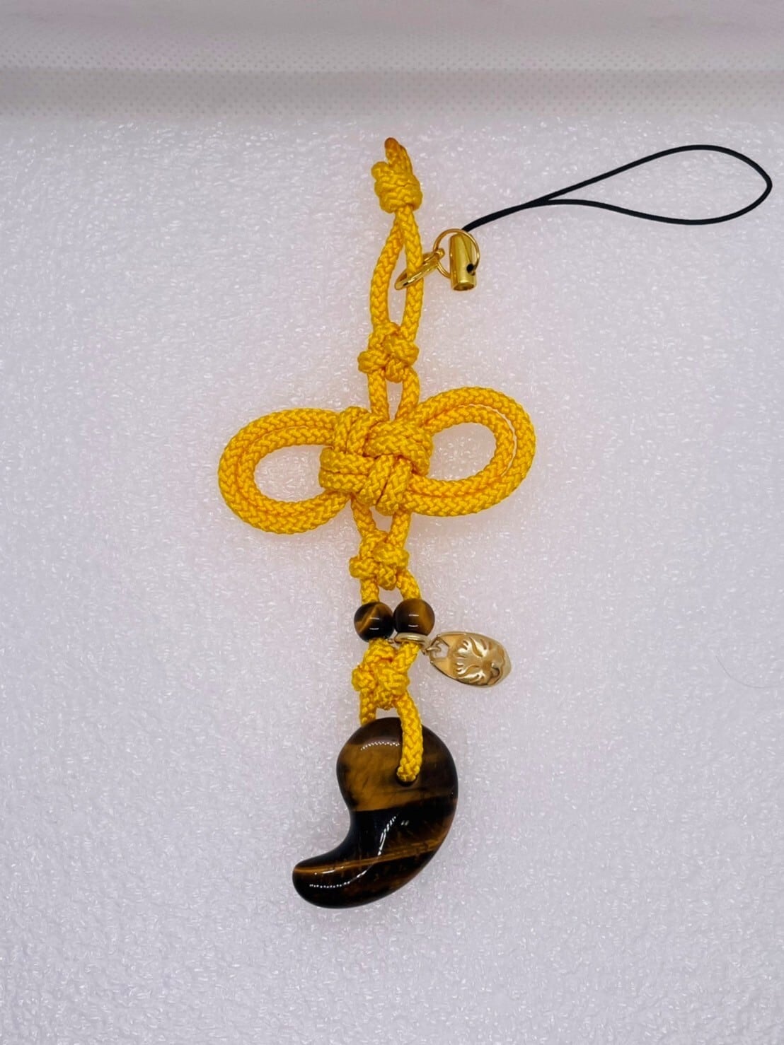 金運のほか変化するための洞察力や決断力を与えてくれるパワーがあります。ほかの結び守りで迷っている時におススメになります。金運には健康運も入ってきますので…紐のカラーも金運と変化のパワーのある黄色にしています。キツネ面のチャームになります。
