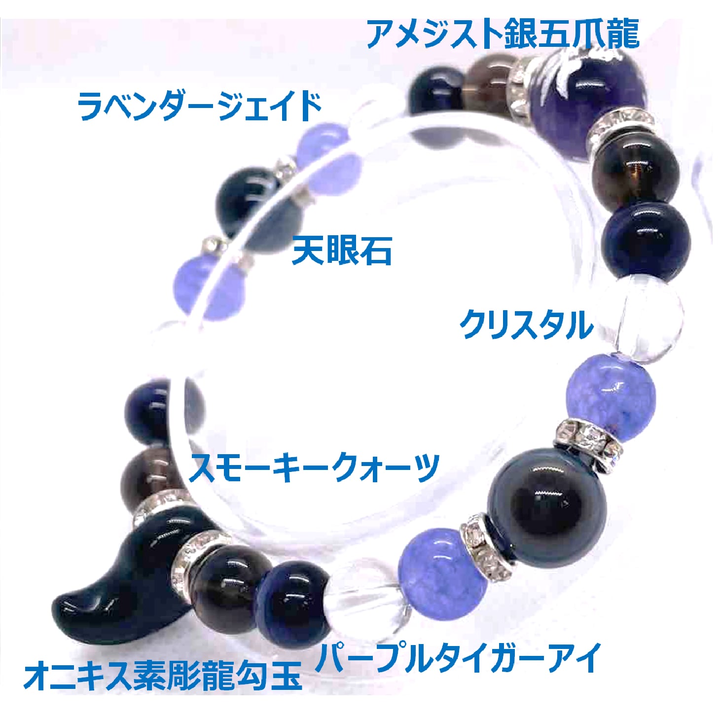 勾玉:オニキス素彫龍(アメジスト銀龍(五爪龍)・天眼石・パープルタイガーアイ・スモーキークォーツ・ラベンダージェイト・クリスタル)